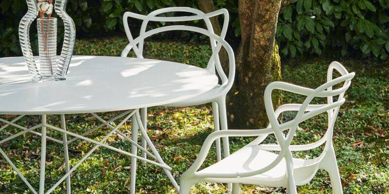 Kartell est une maison italienne dont le matériau de prédilection, le plastique, possède de nombreuses qualités : léger, durable, recyclable… C’est pourquoi de nombreuses pièces de la marque sont adaptées aussi bien à un usage intérieur qu’extérieur. C’est le cas notamment de la célèbre chaise Masters dessinée par Philippe Starck et Eugeni Quitllet, dont le design futuriste se caractérise par un dossier où s’entrelacent des lignes sinueuses et organiques.